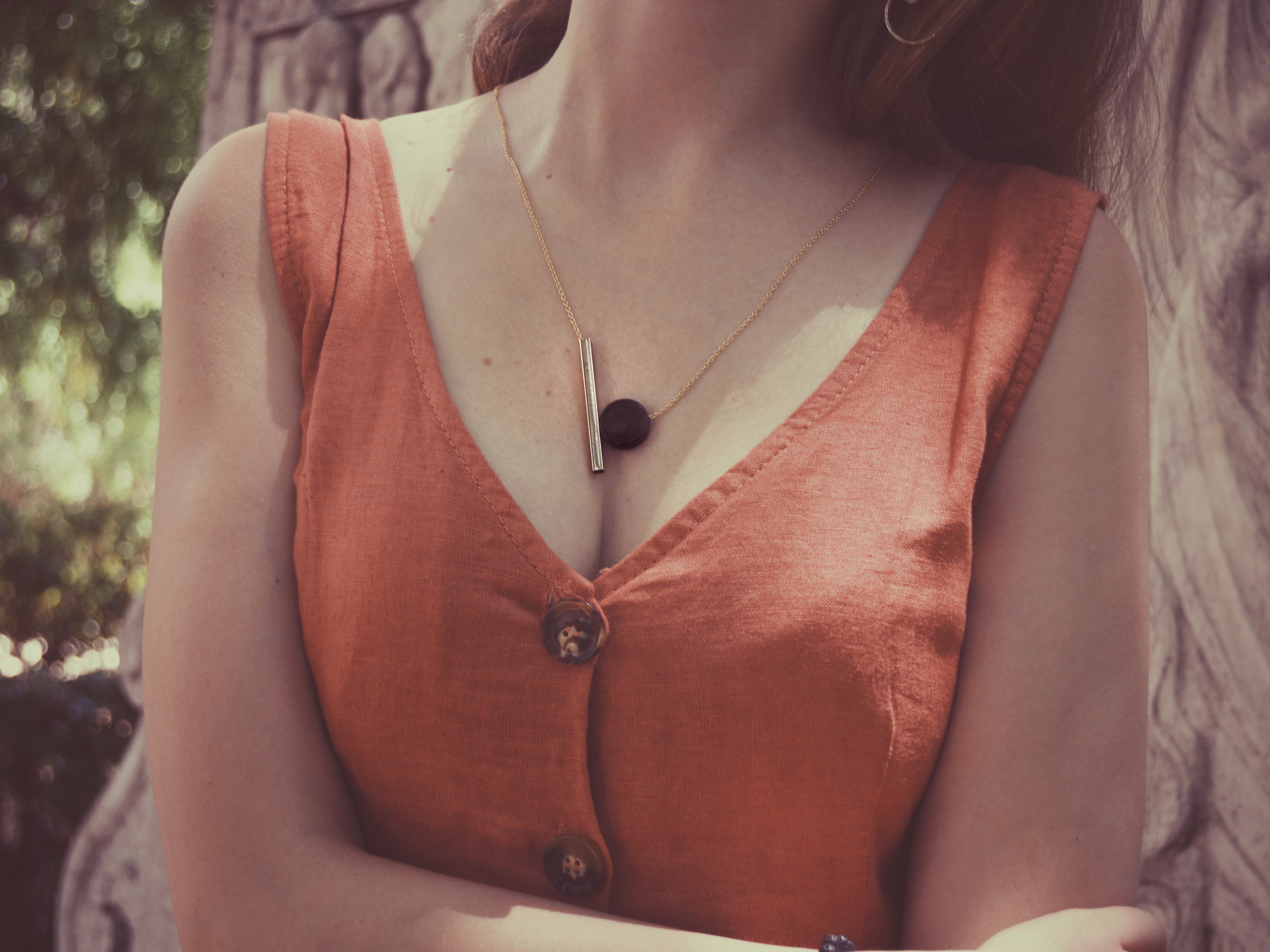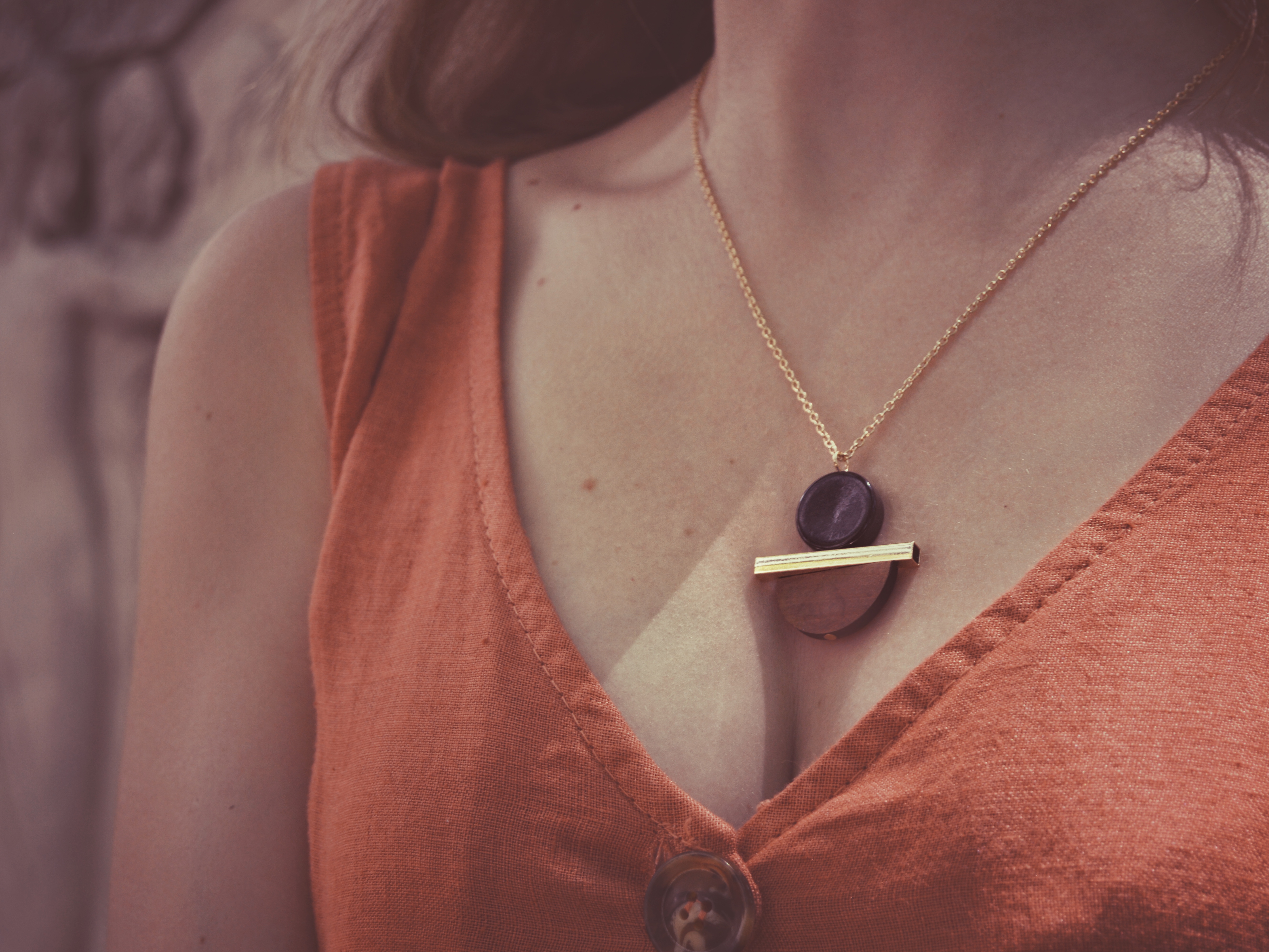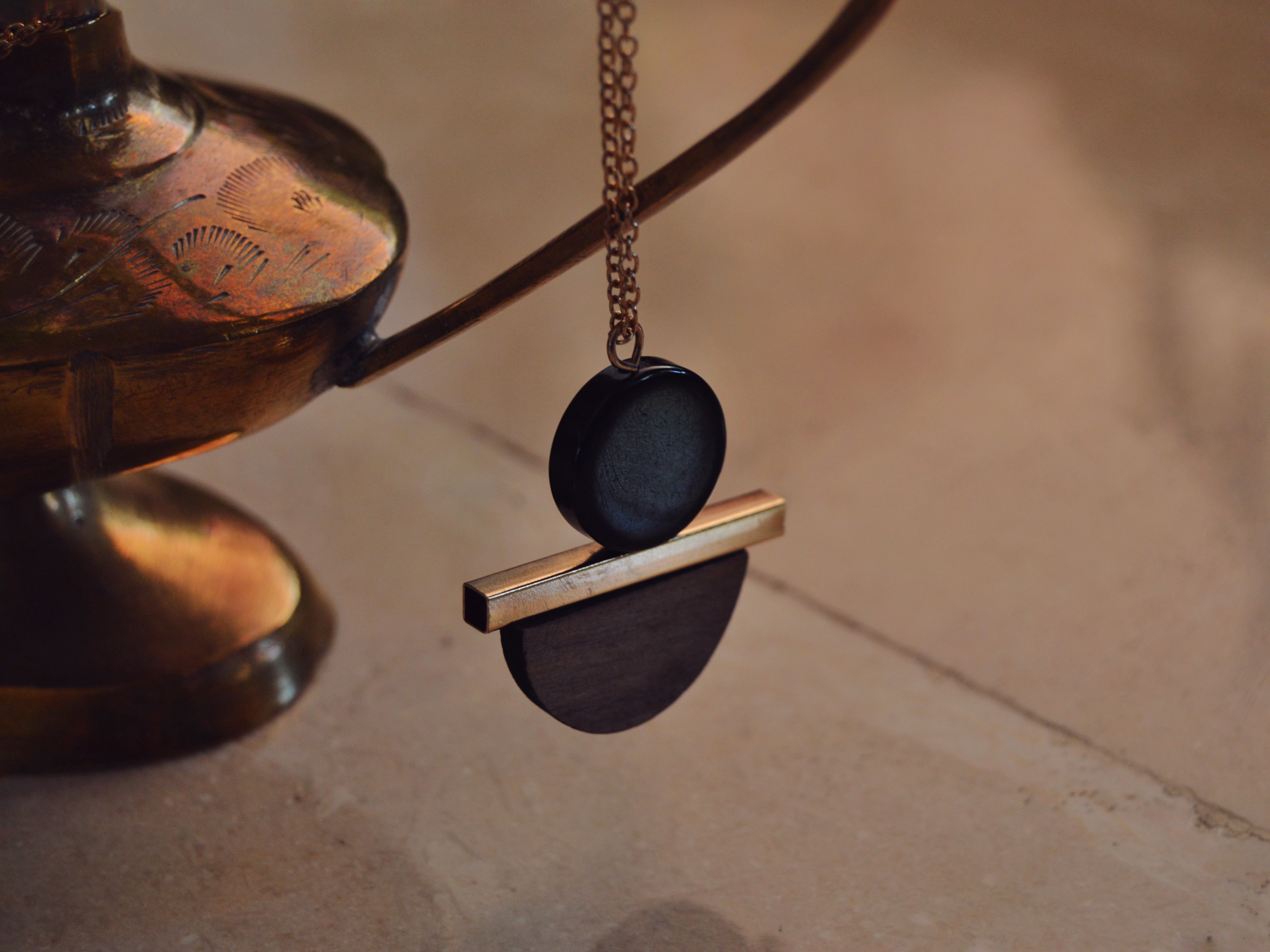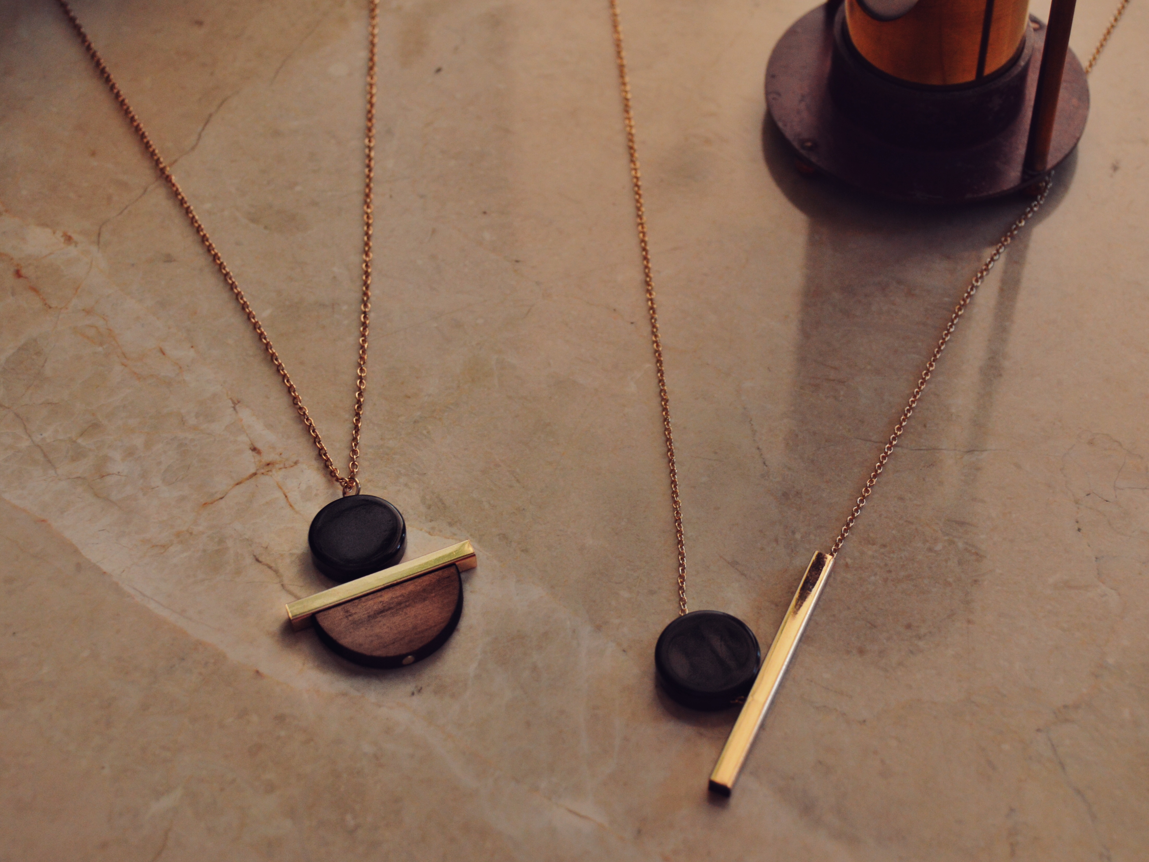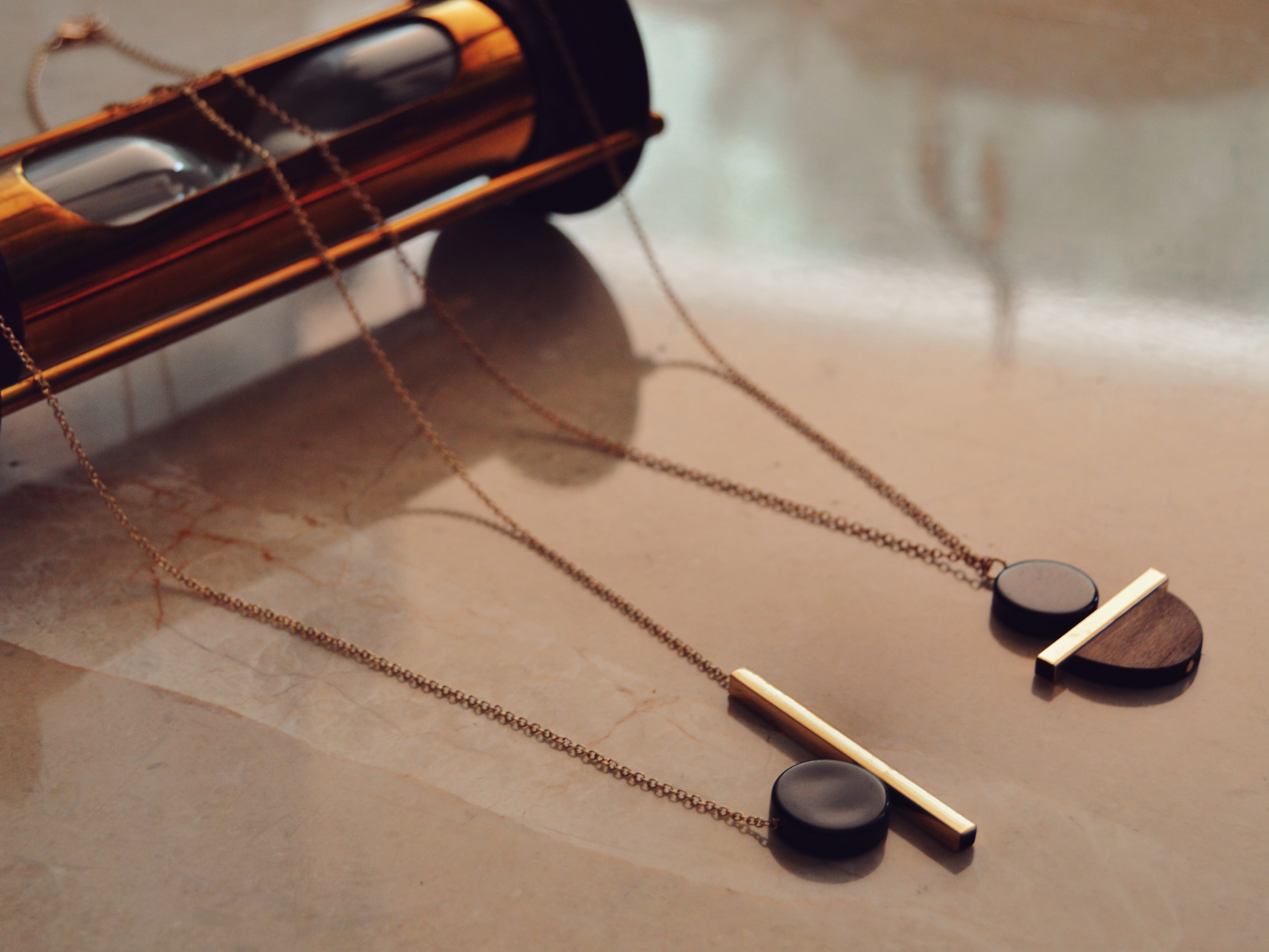 Inspirados en el cubismo, estos collares con elementos circulares de resina negra, semicírculos de madera y formas tubulares doradas son el complemento perfecto para destacar con elegancia.