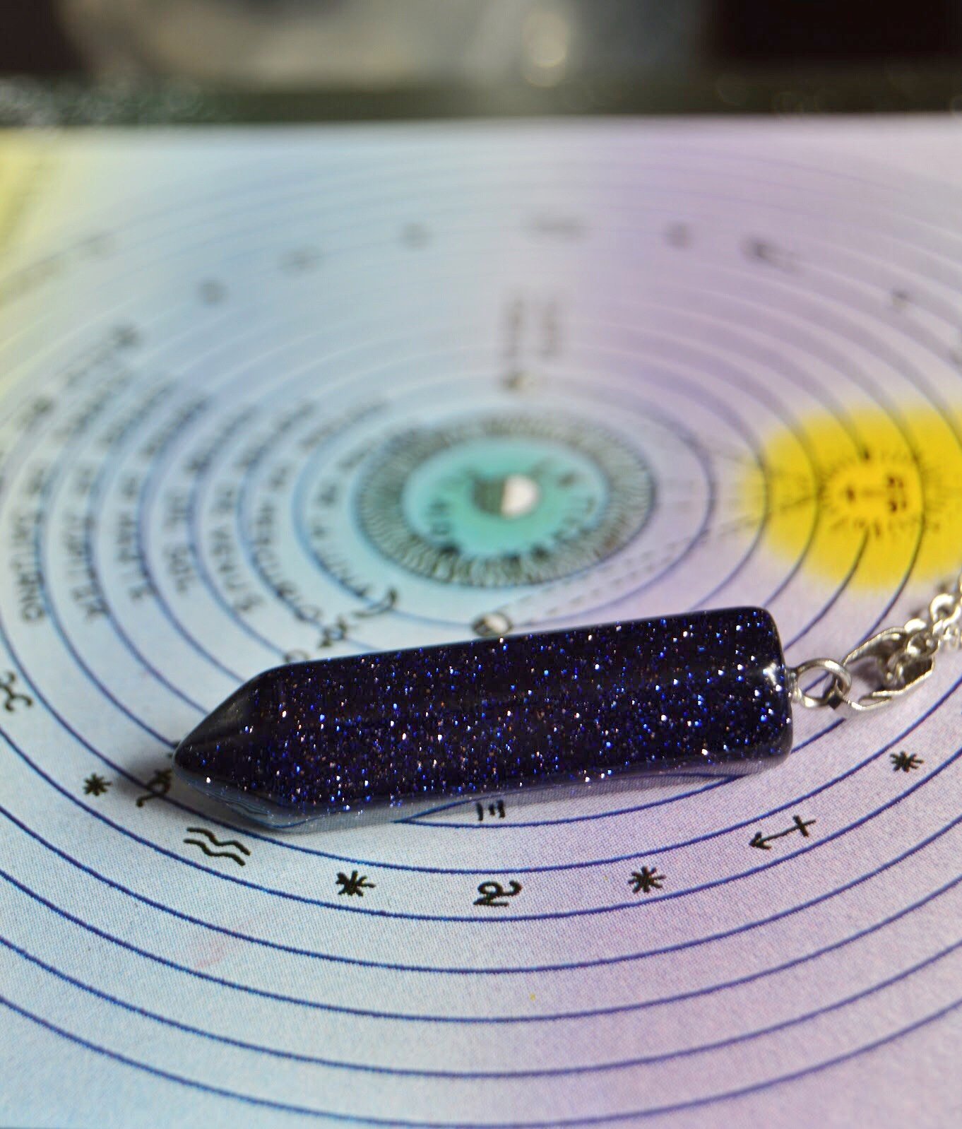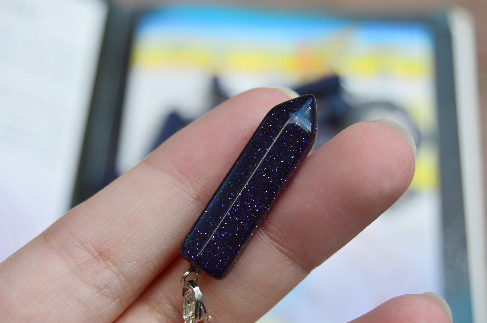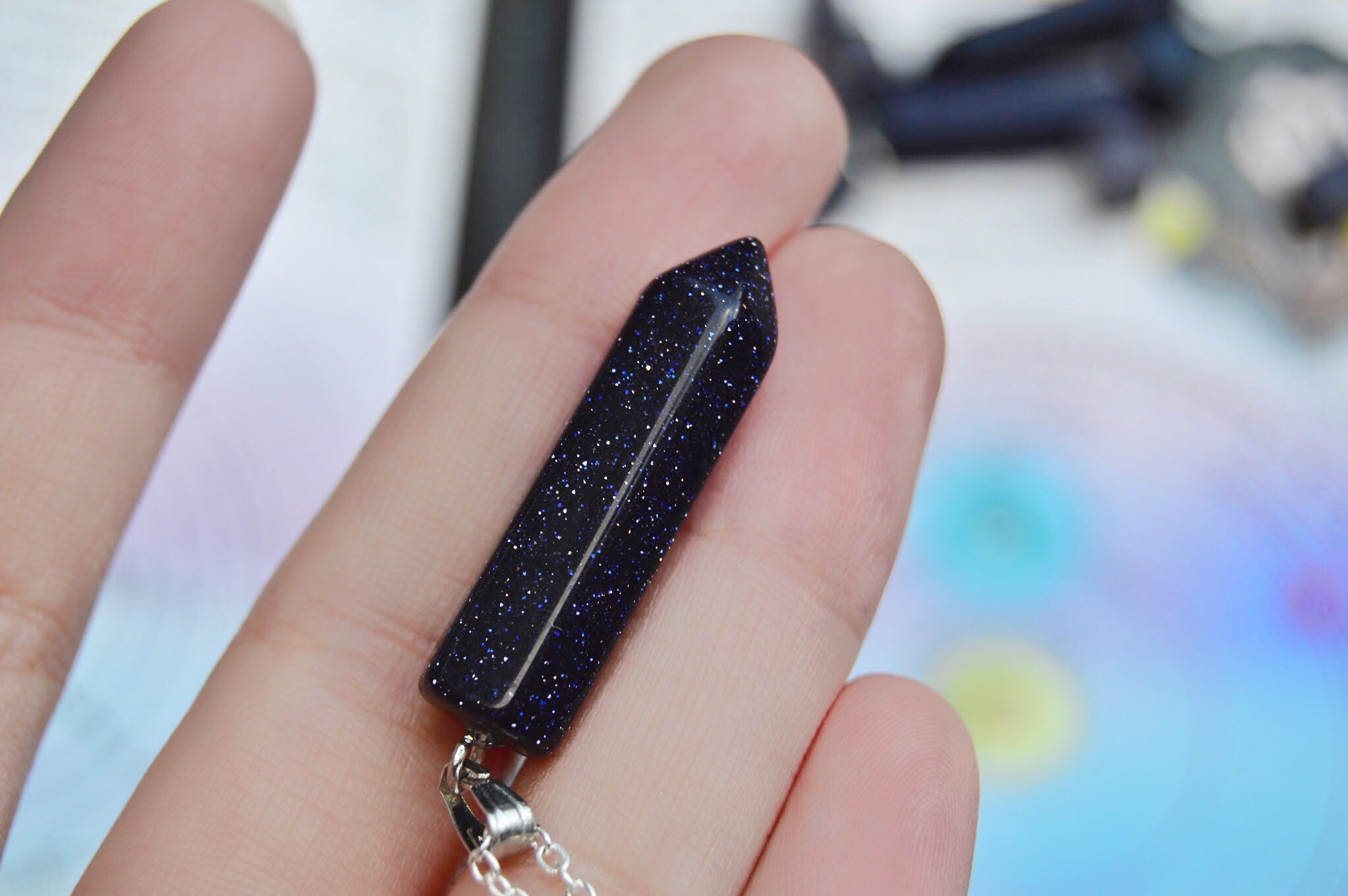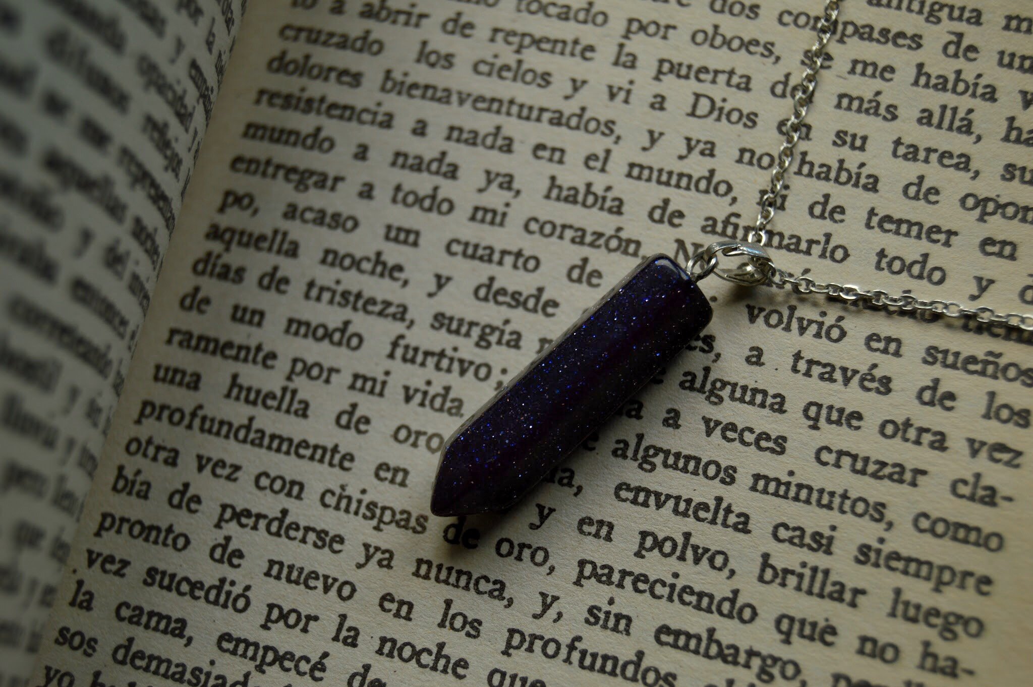 La aventurina azul es un cristal con incrustaciones muy brillantes de yoduro de plomo. Cadena plateada incluida.